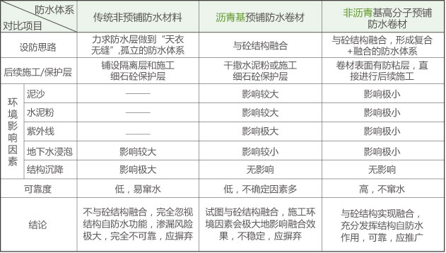 從上述對比可以看出傳統防水卷材建立的是孤立的防水體系,防水效果完全建立在防水層“天衣無縫”的基礎上,結構主體防水功能基本忽略不計,這是一種不切實際的幻想。反之,凱倫MBP-P高分子預鋪防水卷材能夠與混凝土結構主體共同建立復合+融合的防水體系,讓混凝土結構成為防水的主力軍。從此預鋪防水層的個別缺陷不會再導致整體防水體系的失效。從中我們也可以看出,防水層與混凝土結構的牢固融合是建立有效復合防水體系的前提,這正是凱倫公司該項產品對行業和社會的最大貢獻!