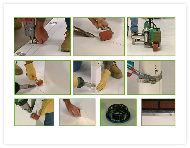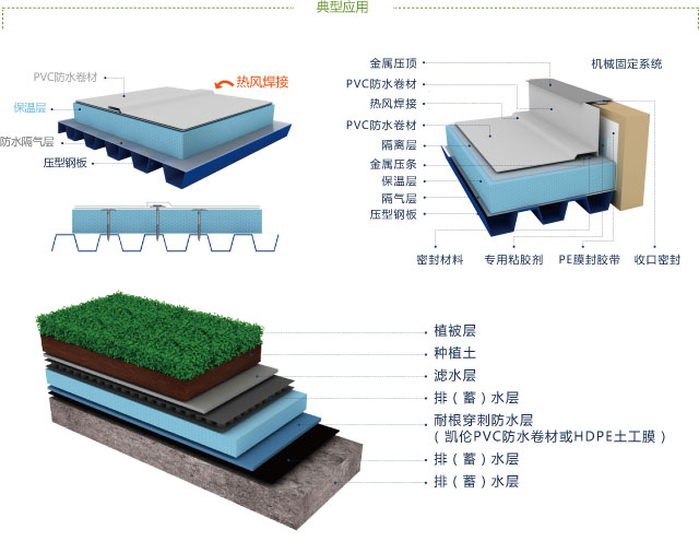 在外露工程機械固定法施工時,根據經驗,非加強型的材料在負風壓力作用下,出現反復拉伸,導致累積塑性變形,出現卷材斷裂、固定點劈裂、收頭脫落等破壞。凱倫公司凱倫PVC防水卷材織物內增強型提高了抗拉力、撕裂強度及耐穿刺性等性能,從而進一步提高了對機械固定工法的適用性,加上完整的配套材料,使該系統特別適合用于單層屋面工程。