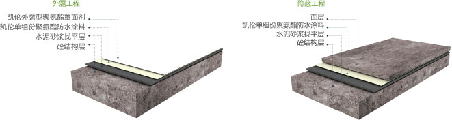 用于外露工程時,可在聚氨酯涂料防水層表面涂刷凱倫外露型聚氨酯罩面劑,其具有隔熱、反射作用,抵消溫度和紫外線照射影響的同時也能節省能耗。配套罩面劑還具有表面強度高、耐磨、自潔性好等特點,避免了外露型丙烯酸涂料在高溫下易變軟、變粘而粘附灰塵、雜物的問題。